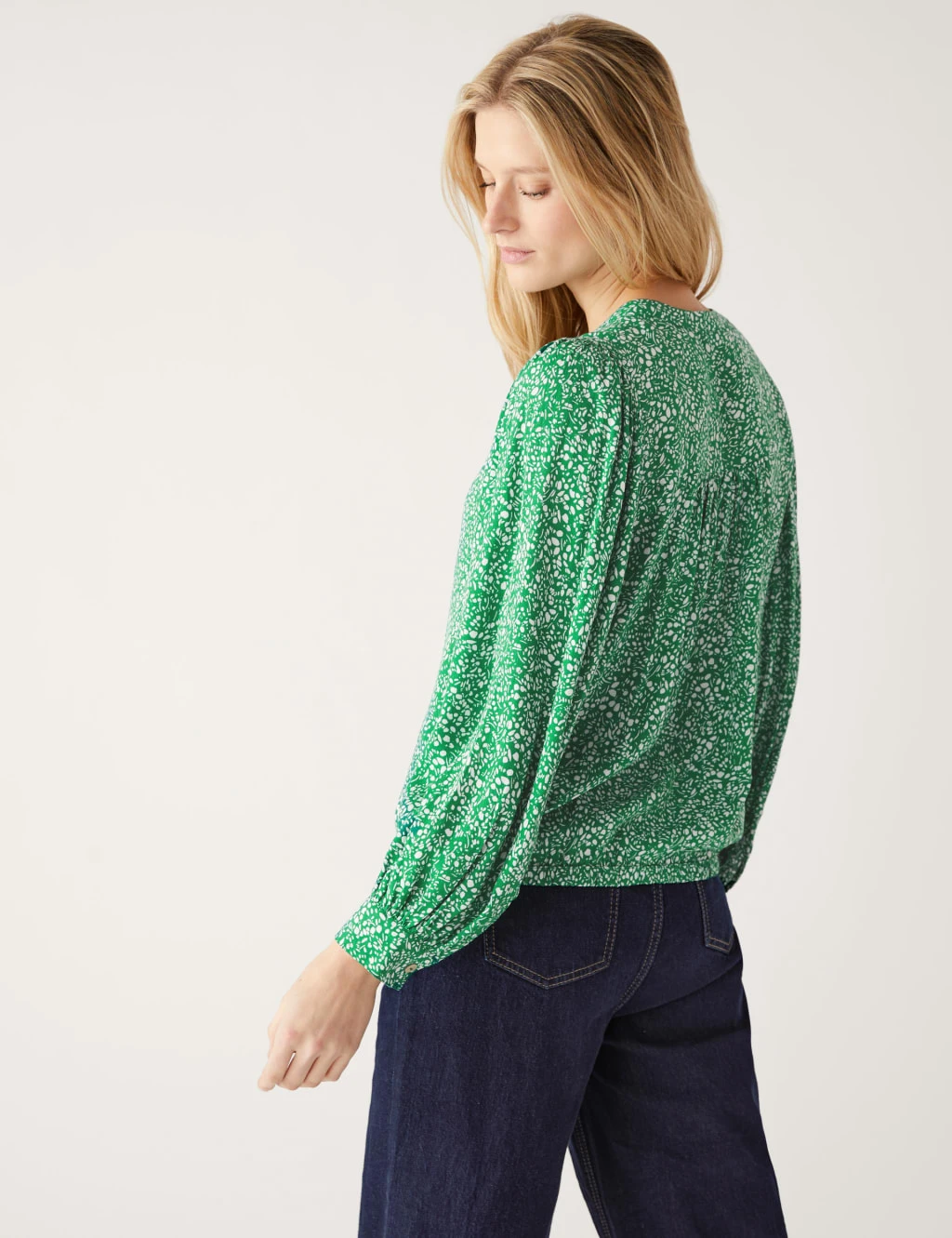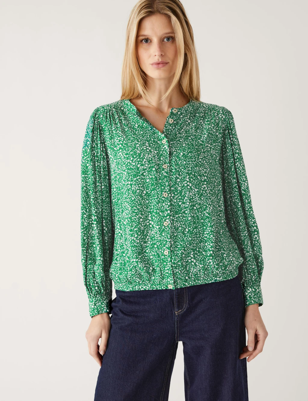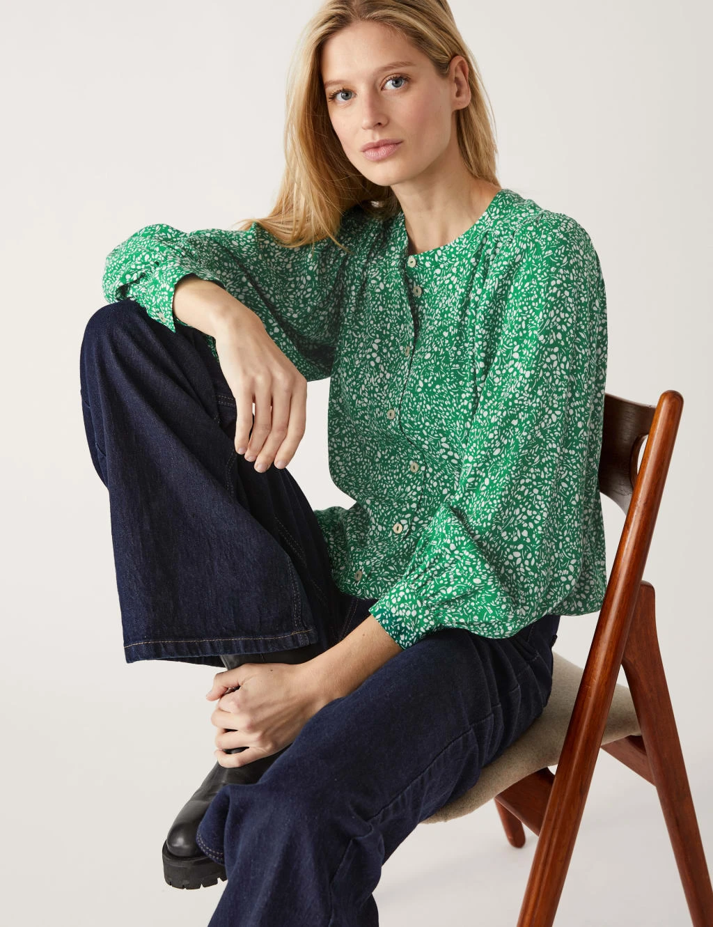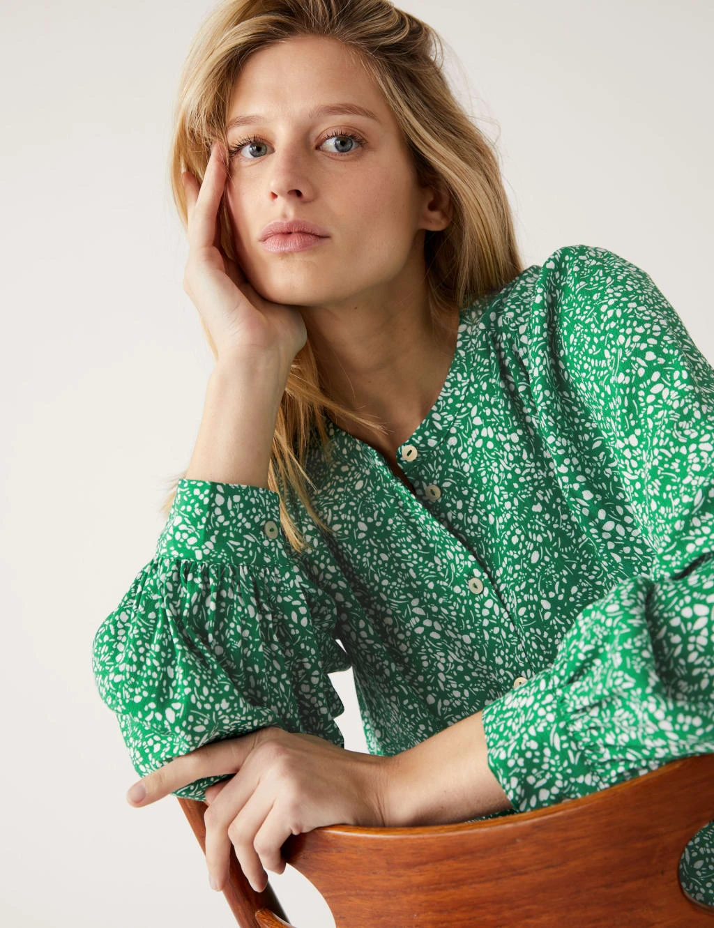 This pretty blouse will add a feminine touch to your wardrobe. It’s cut to a regular fit with full, floaty sleeves. Discreet buttons at the front match those on the cuffs for a subtly elegant feel. The elasticated hem gives a relaxed ‘bubble’ look.