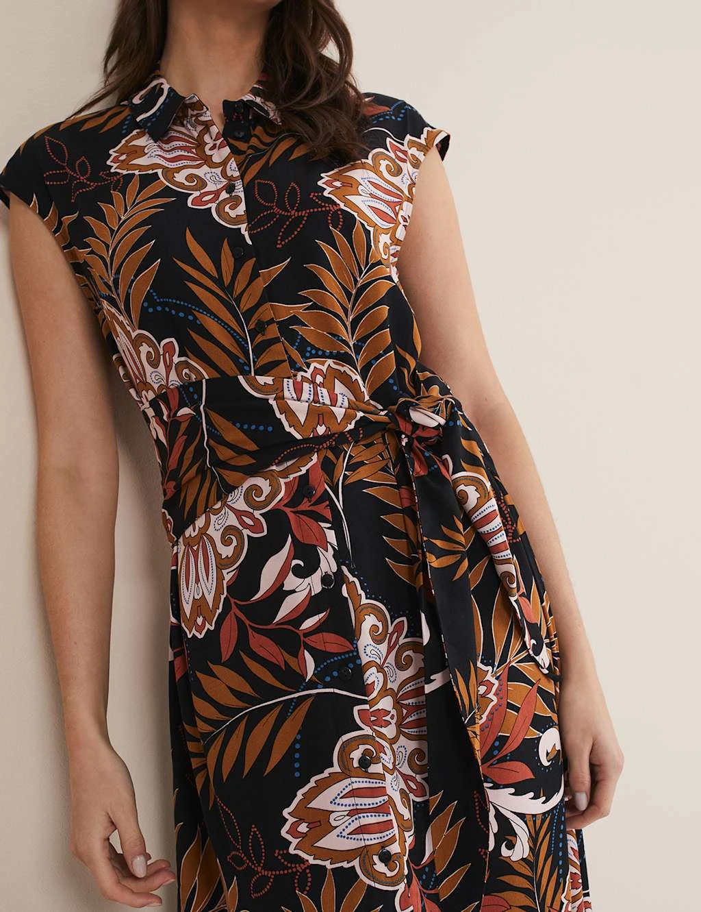 A bold print lends a statement look to this waisted dress from Phase Eight. This short-sleeved design is cut to a comfy regular fit, with a matching fabric belt that nips in at the waist for a flattering silhouette. The midaxi-length skirt adds an elegant feel, while a collared neck and button-through fastening provide a classic finish.