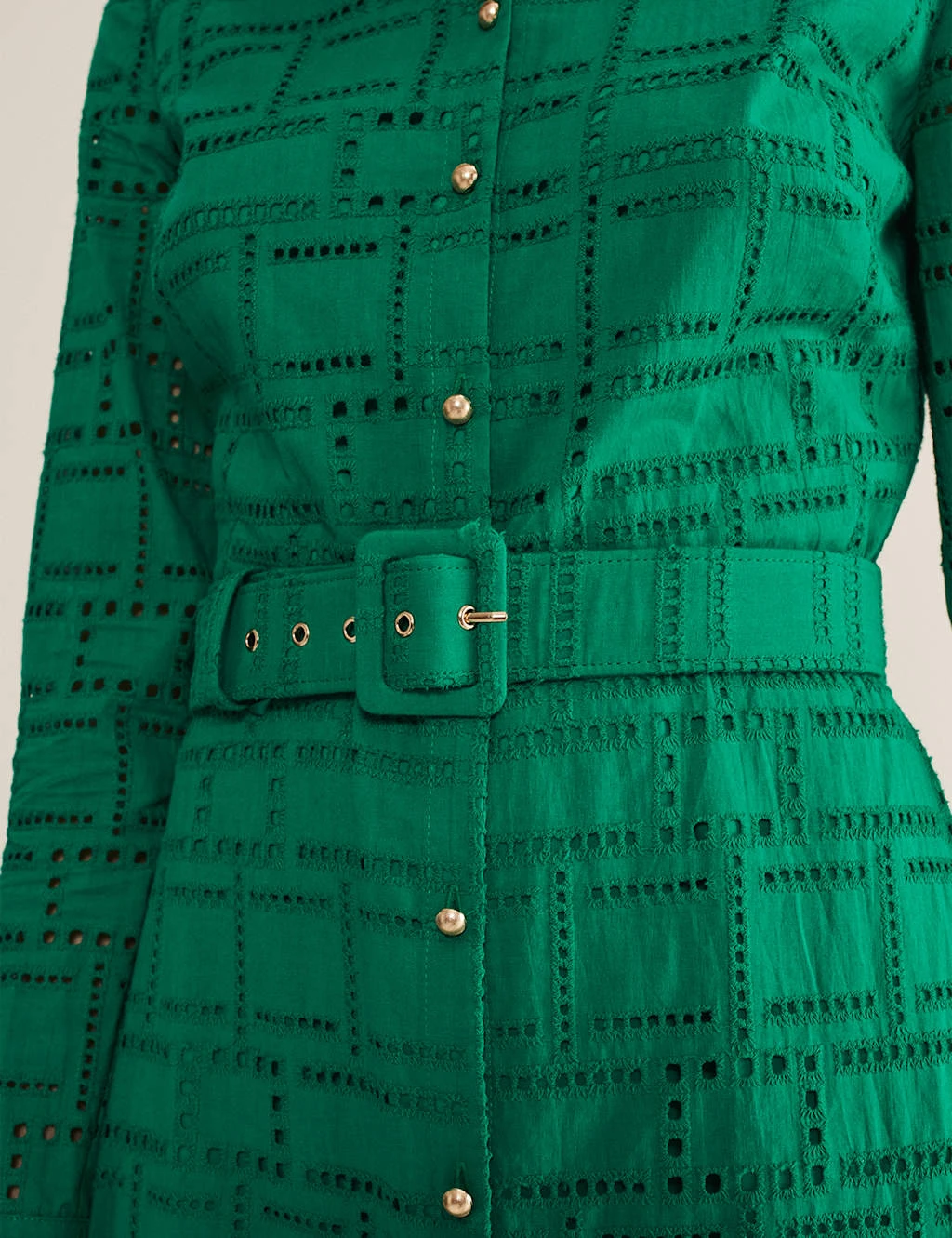 Create a sophisticated look with this pure cotton shirt dress from Phase Eight. This elegant piece is cut to a regular fit, featuring gold-tone button-through fastenings, a collared neck and long cuffed sleeves. The belted waist adds extra shaping to the silhouette and the hem sits at a flattering midi length. This dress features a striking geometric broderie pattern and is lined for comfort.