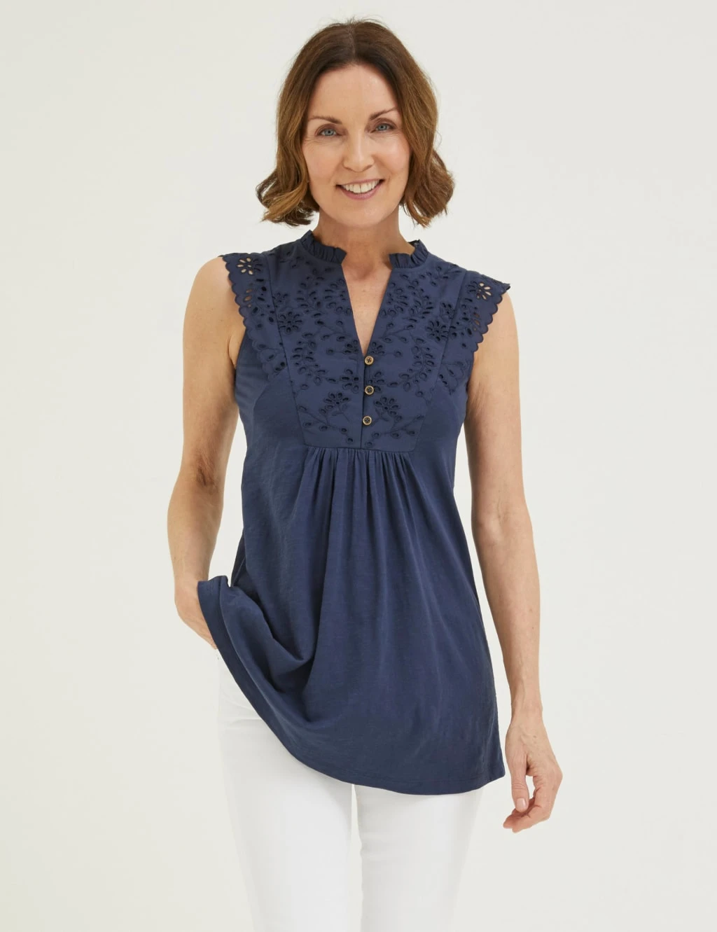 For a polished look, turn to this elegant pure cotton tunic from FatFace. It’s designed in a regular fit, with a summer-ready sleeveless silhouette and a flattering longline cut. For a stylish finish, its notch neckline is detailed with a three-button fastening and surrounded by intricate floral embroidery.