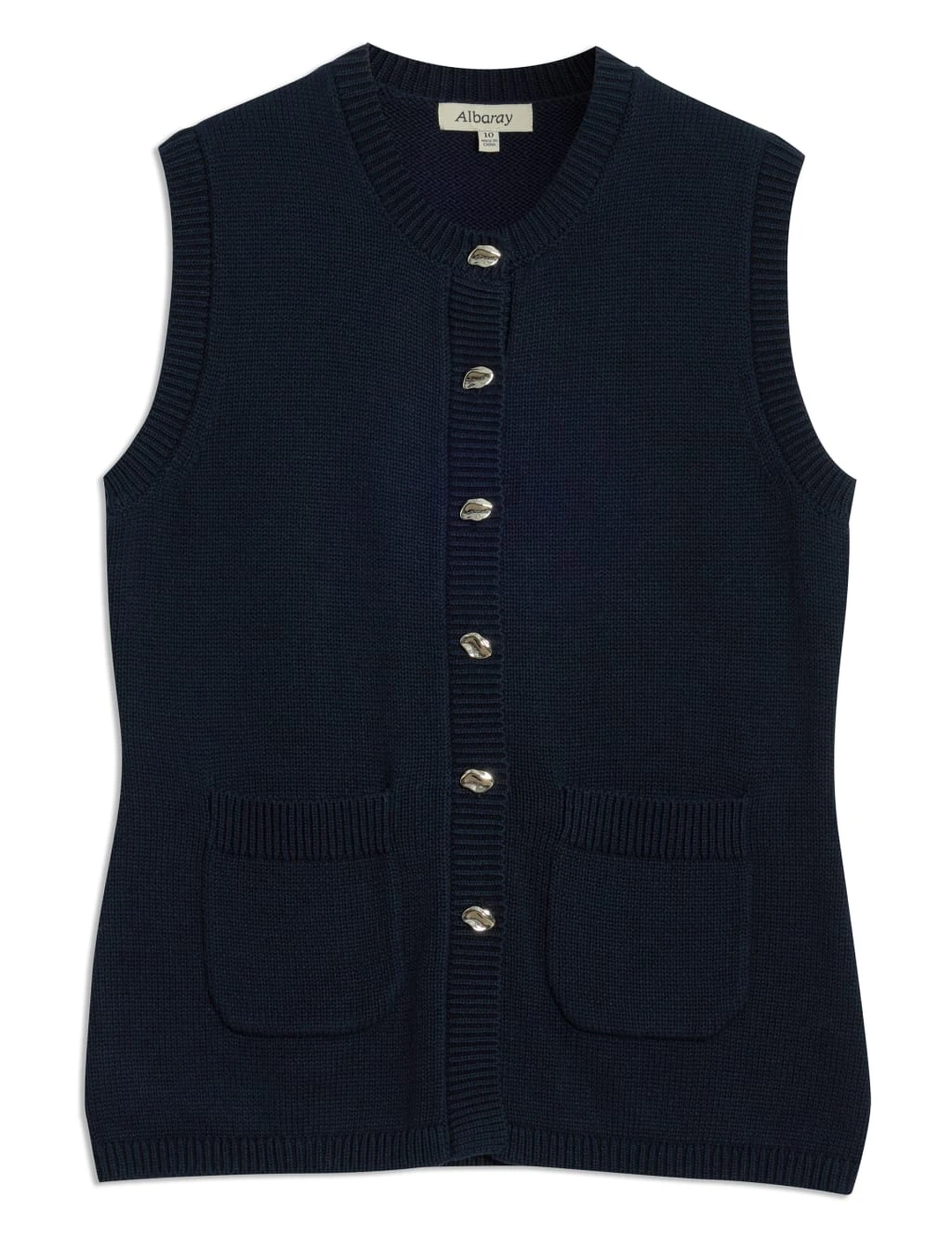 Layer up in style with this knitted waistcoat by Albaray. It’s designed in an easy regular fit with a timeless crew neck and ribbed trims. Distorted buttons add unique detail to the piece, which is finished with patch pockets and a longline hem for extra coverage.