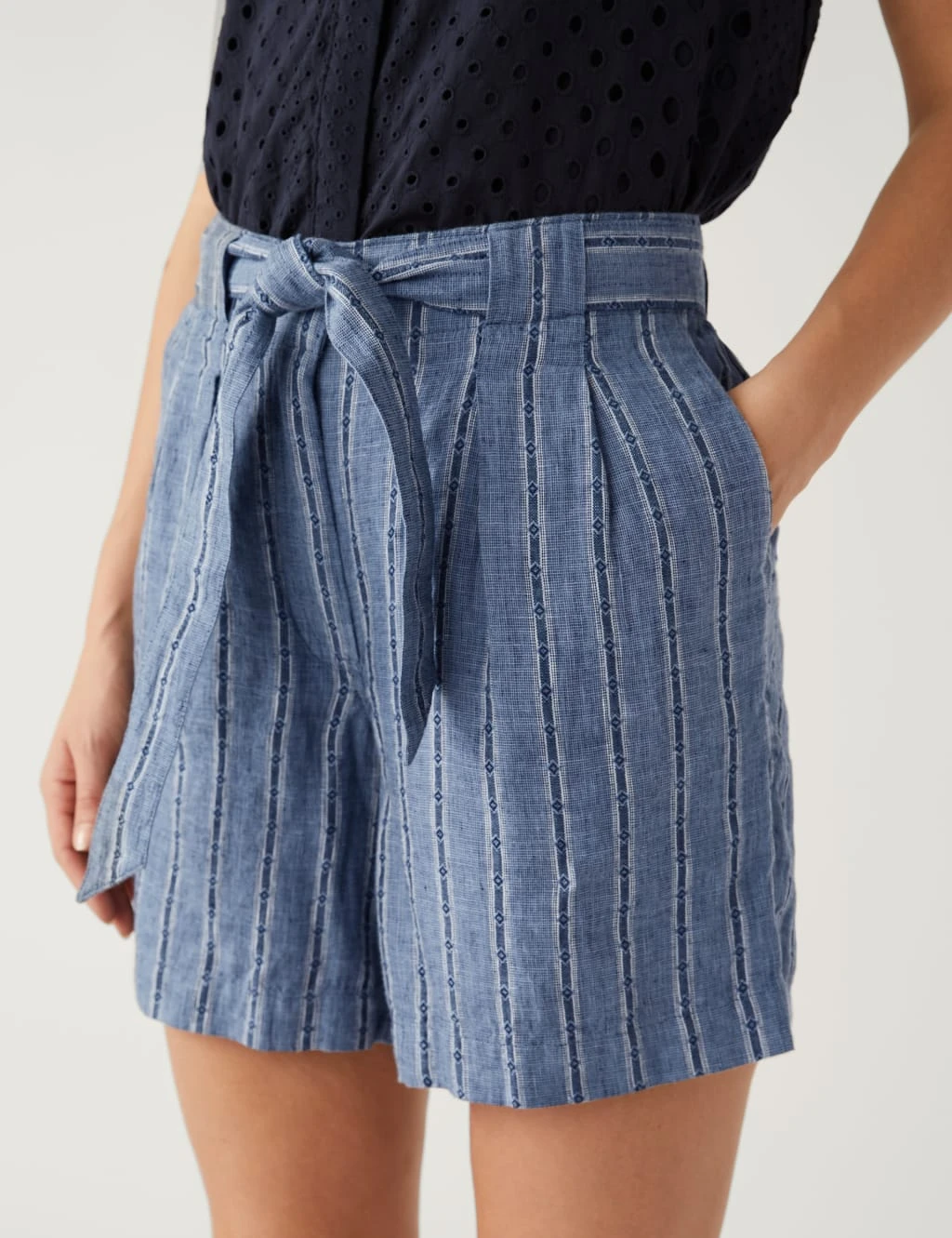 These pure linen striped shorts are an eye-catching summery option. The comfortable high-waisted design has a concealed hook and bar fastening, with a detachable belt for a smart look. Handy pockets at the sides and back add a practical finishing touch.