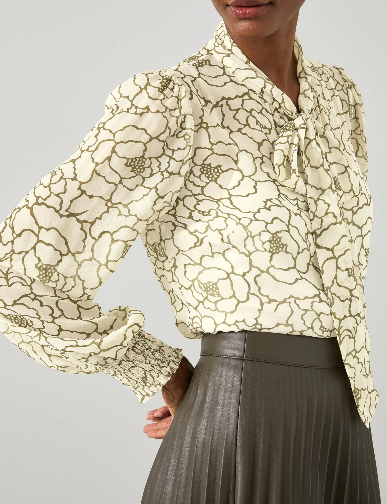 Add a touch of luxury to your smart-casual edits with this blouse from LK Bennet. It’s cut from fluid silk to a classic regular silhouette. This versatile style is enhanced with an allover floral print and an elegant self tie neck. The voluminous long sleeves are neatly finished with gathered detailing on the cuffs.