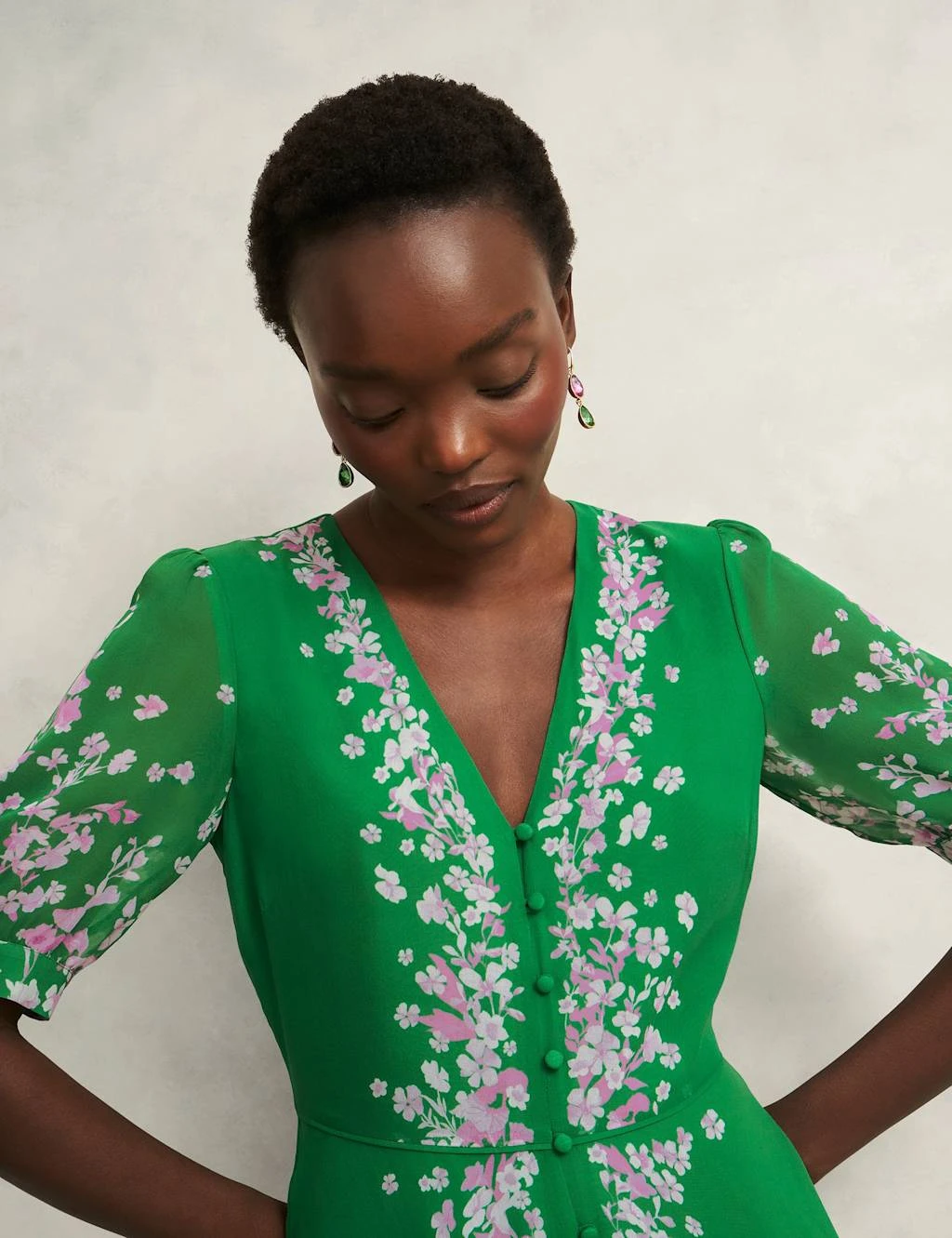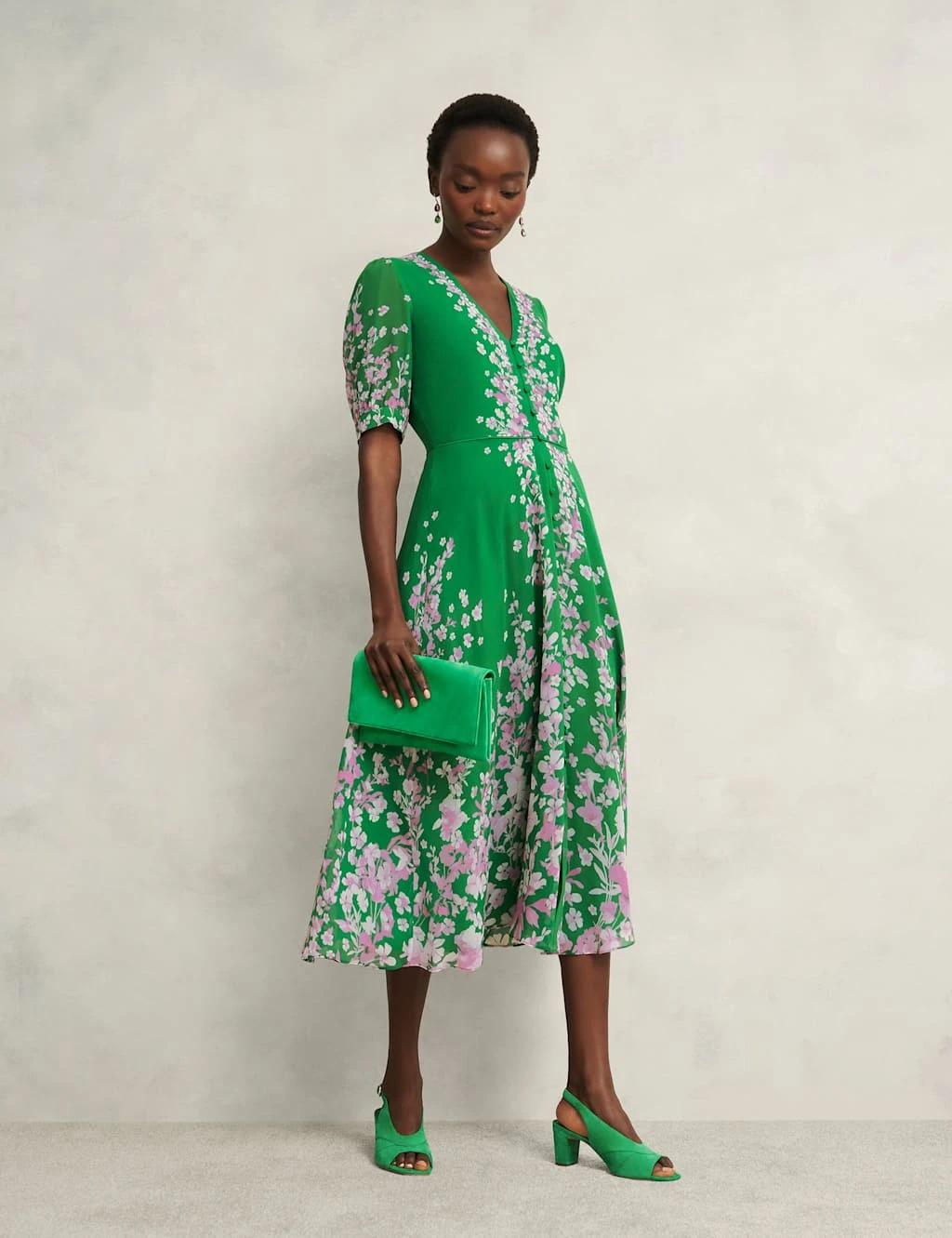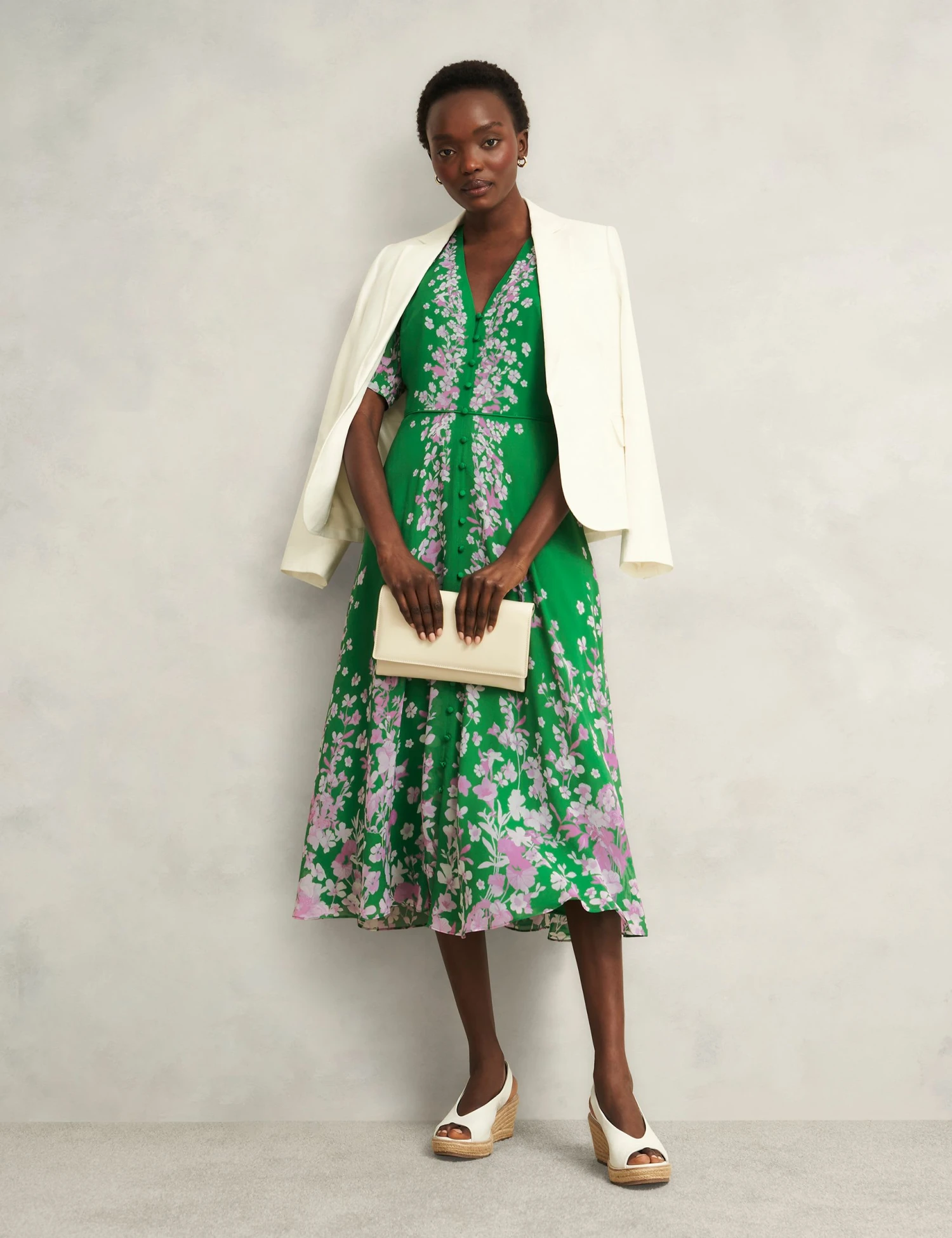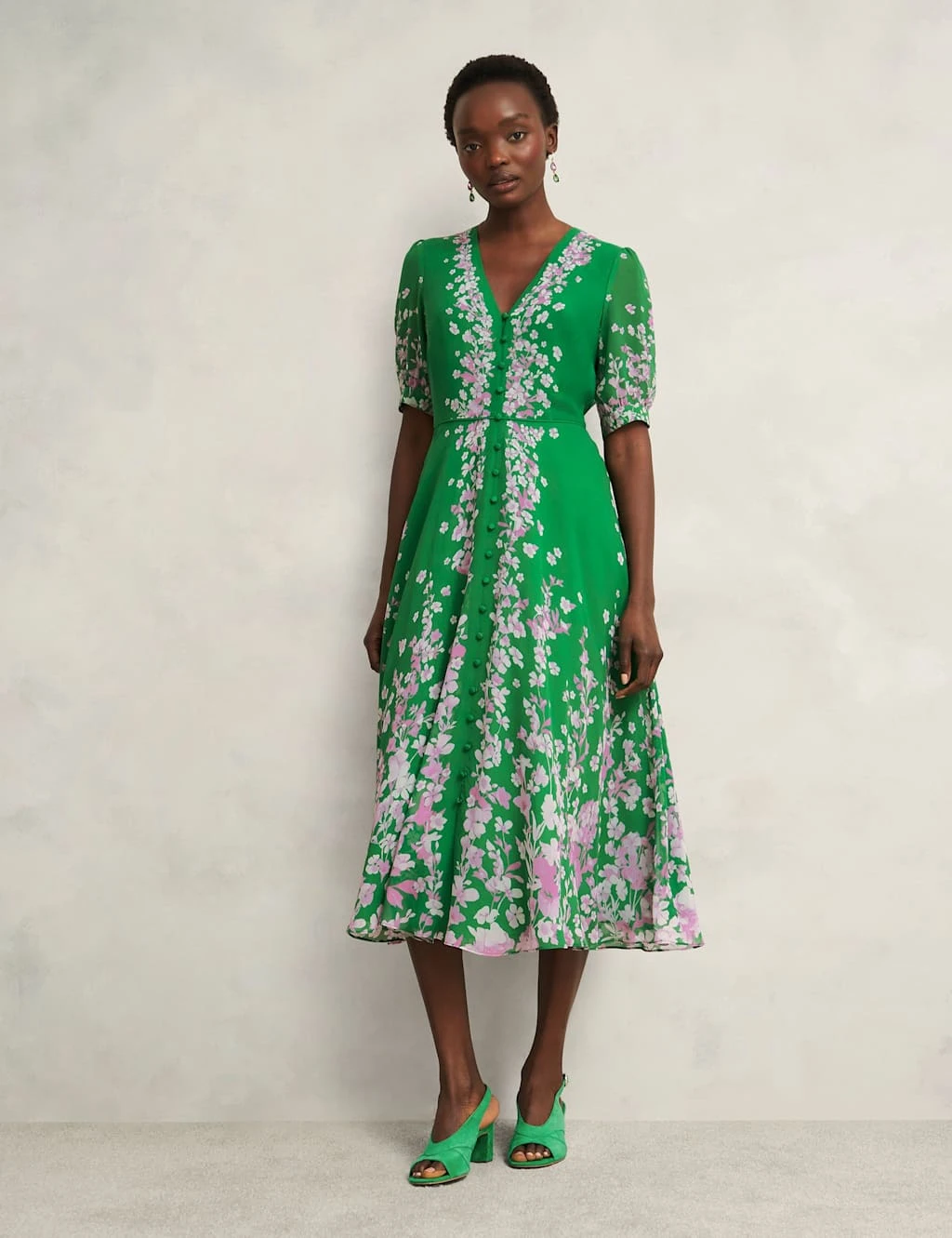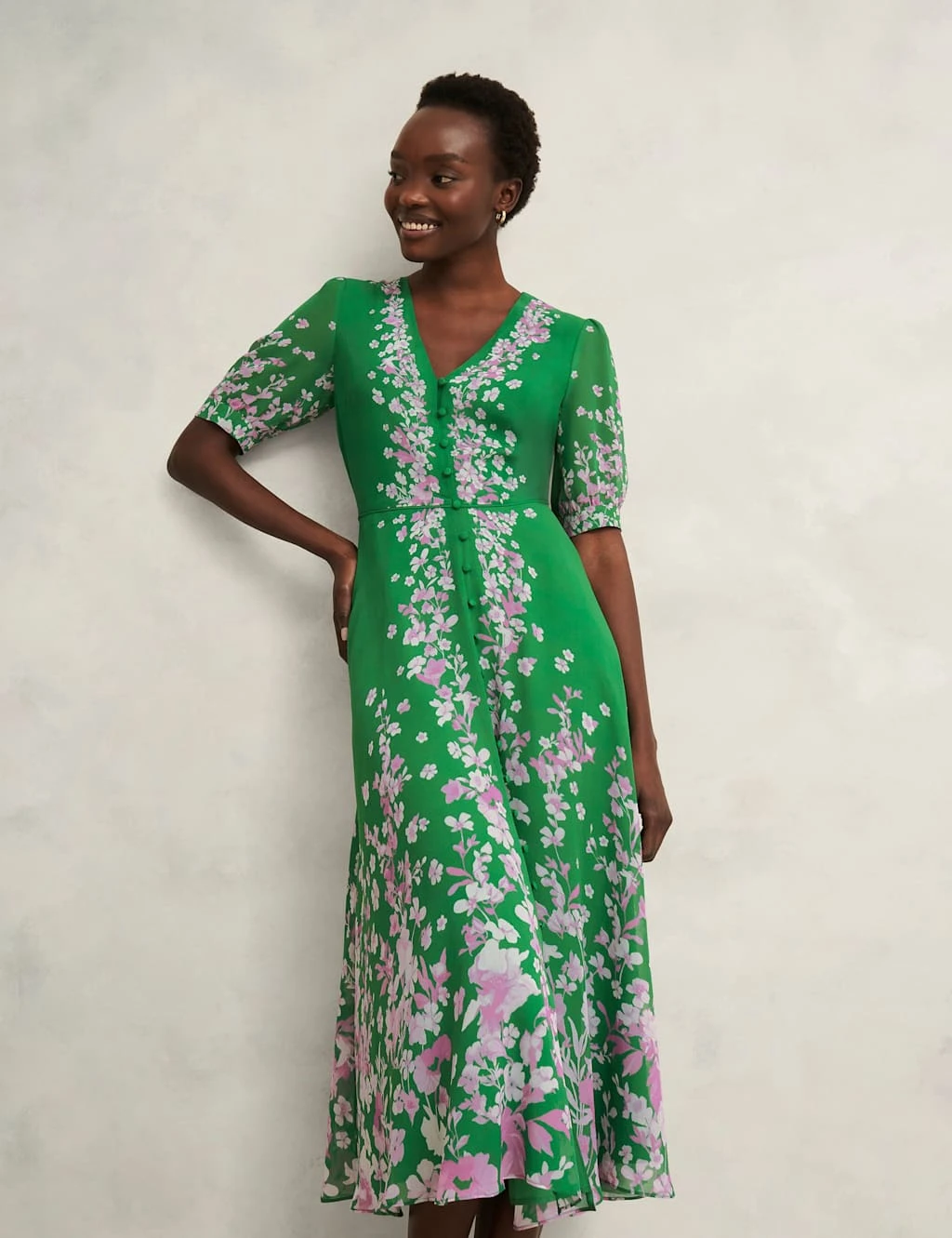 A graceful floral print adds to the romantic appeal of this pure silk dress from Hobbs. It’s designed in a regular fit with a flowing fit-and-flare shape and short, slightly puffed sleeves. Buttons run from the v-neckline through to the midi-length hem for a delicate finish.