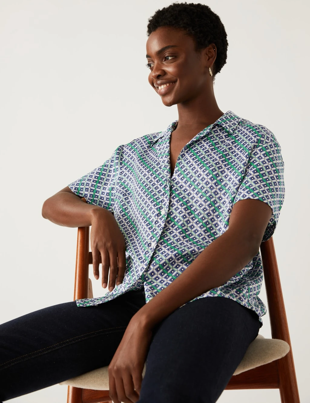 Add contemporary flair to your ensemble with this smooth satin shirt and its eye-catching print. It’s designed in a comfy regular fit, with a neat revere collar and a button-down front for easy wear. The short sleeves offer a breezy feel.