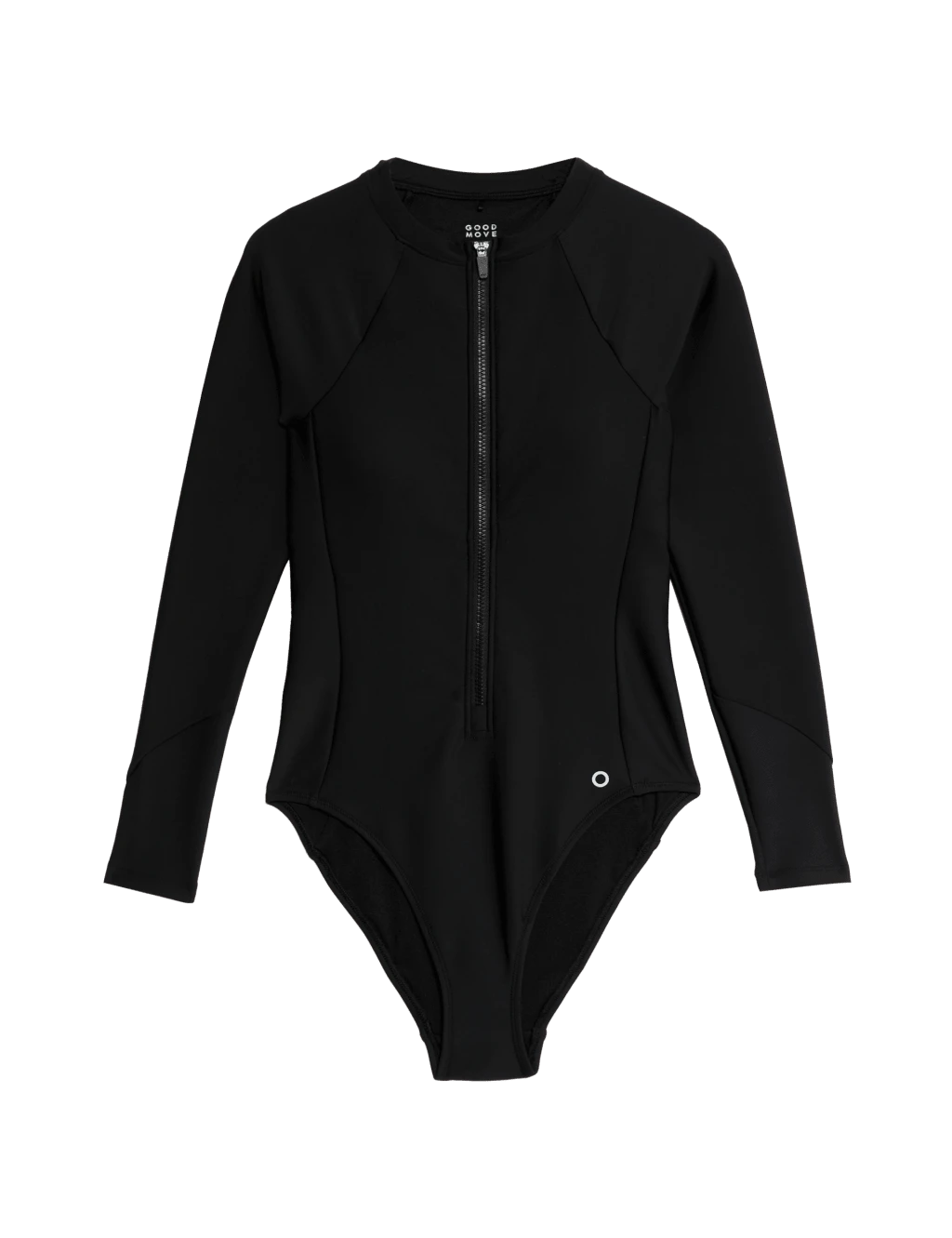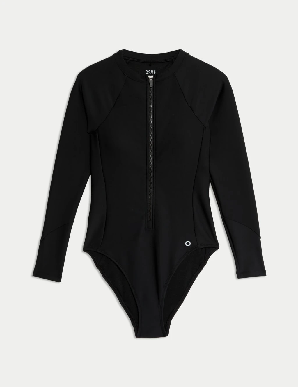 This scuba swimsuit from our Goodmove collection is designed with your water-based activities in mind. It’s cut in a regular fit, with a high neck and long sleeves for extra coverage. A zip fastening and removable padding in the non-wired cups offer a flattering shape. The chlorine-resistant fabric helps to keep the swimsuit looking newer for longer, while added stretch ensures a flexible feel.