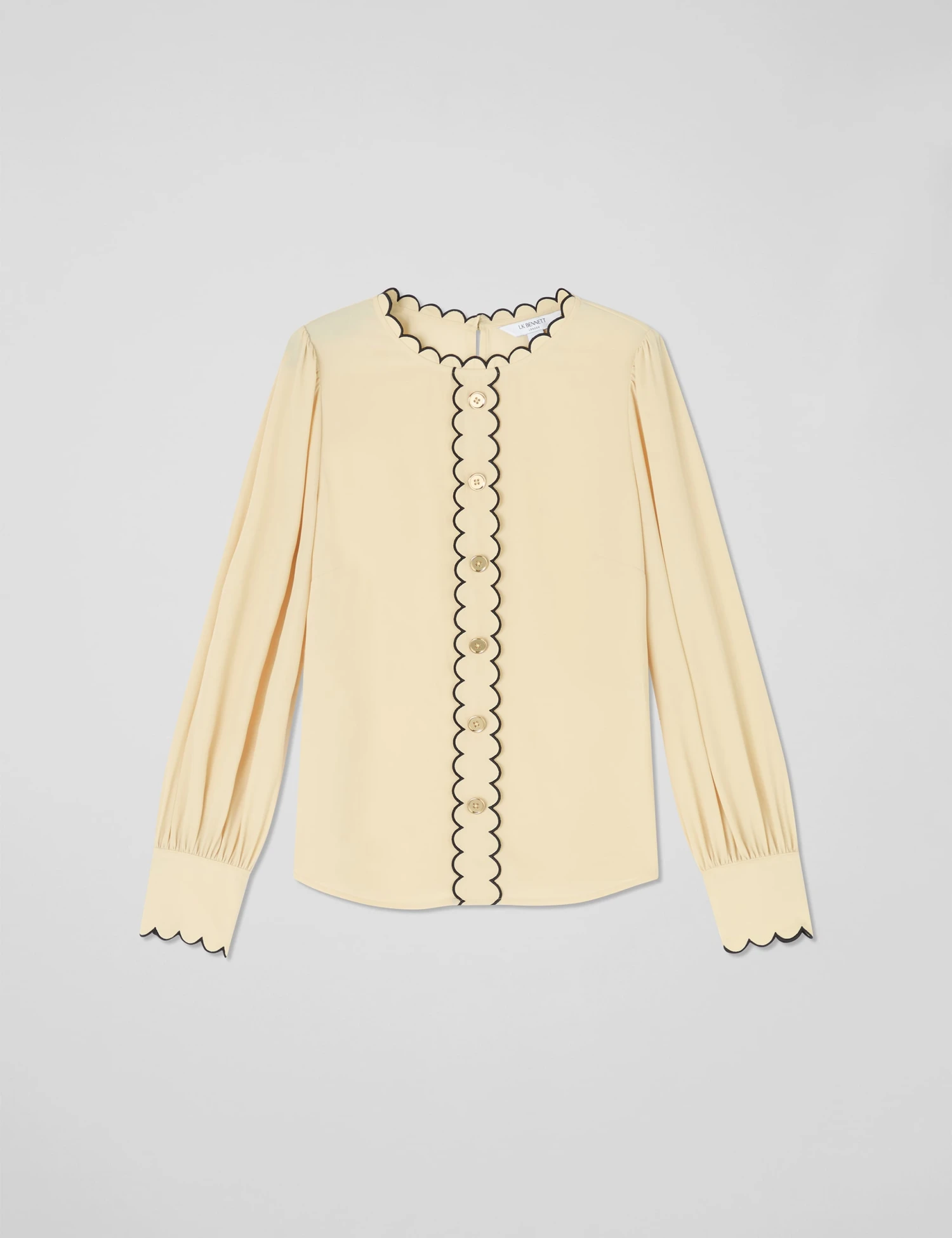 Elevate your weekend outfits with this elegant blouse from LK Bennett. It’s designed in an easy regular fit, with a stand collar at the round neck and a neat button fastening at the back. Scalloped trims and button detailing down the front give this piece an eye-catching look, while the long sleeves are gathered at the shoulders and cuffs for a touch of volume.
