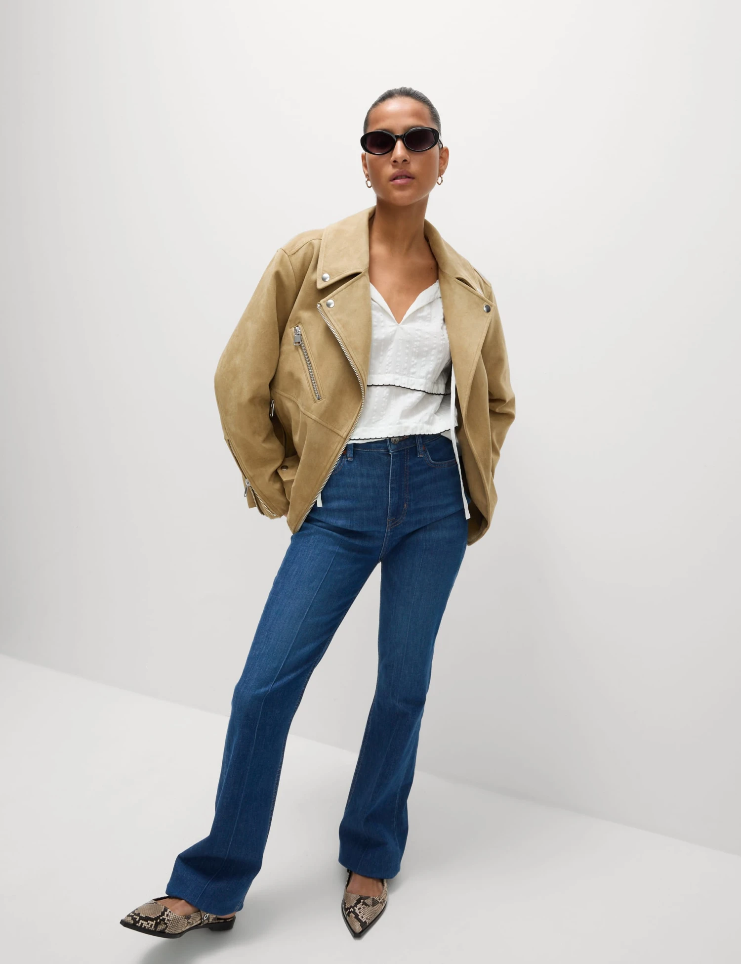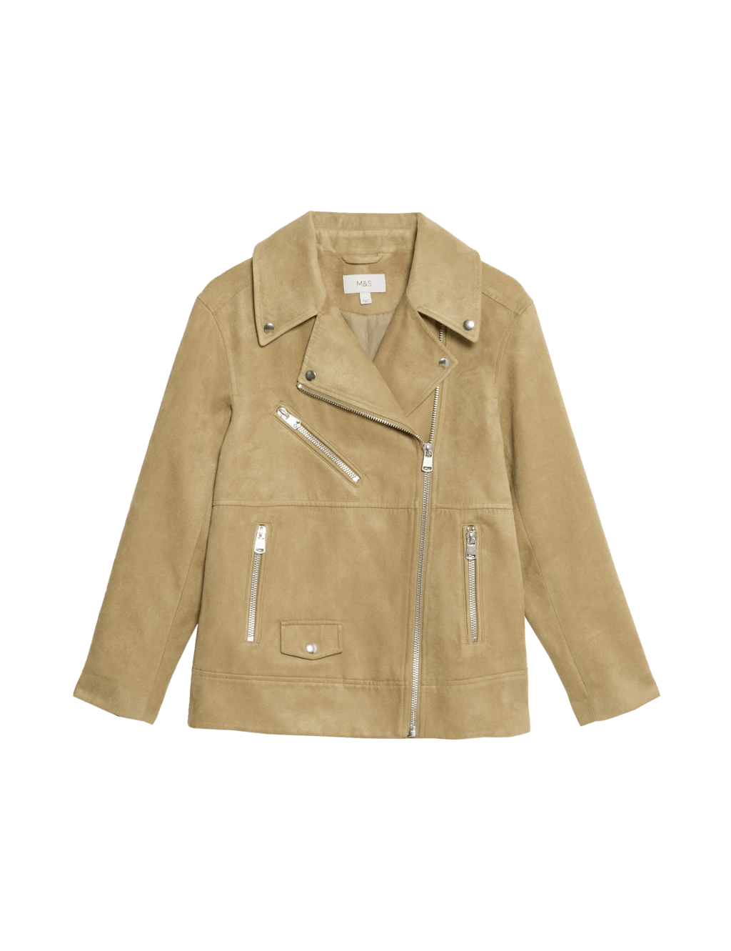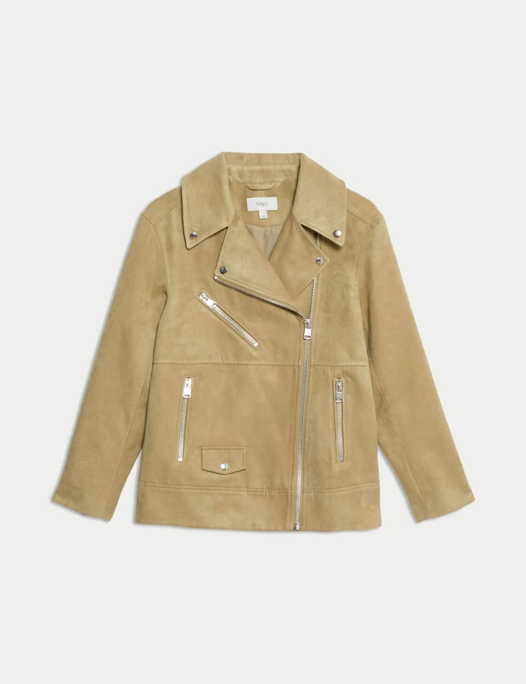 This suedette jacket features all the classic biker-inspired details. It’s cut to a regular fit, with an off-centre zip and a neat collarless neckline. The piece has four pockets, including a ticket pocket with a flap and popper fastening. Stitch detailing and silver hardware add authentic finishing touches. M&S Collection: easy-to-wear wardrobe staples that combine classic and contemporary styles.