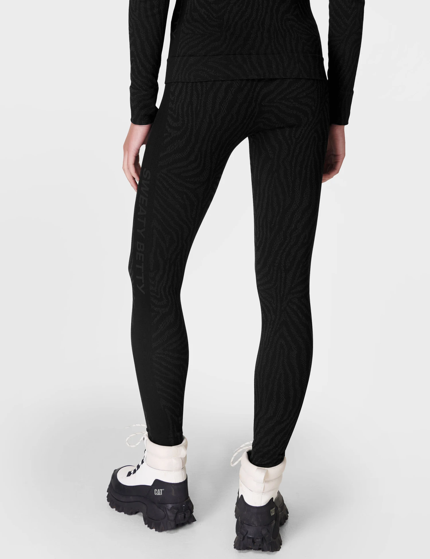 Conquer the slopes or your day in style with these Sweaty Betty leggings. They’re a super-cosy base layer style, with a flattering high waist and sleek seamless fit. A subtle animal print jacquard design adds a touch of sophistication to your look. The thermal fabric moves with you while keeping you warm and dry.