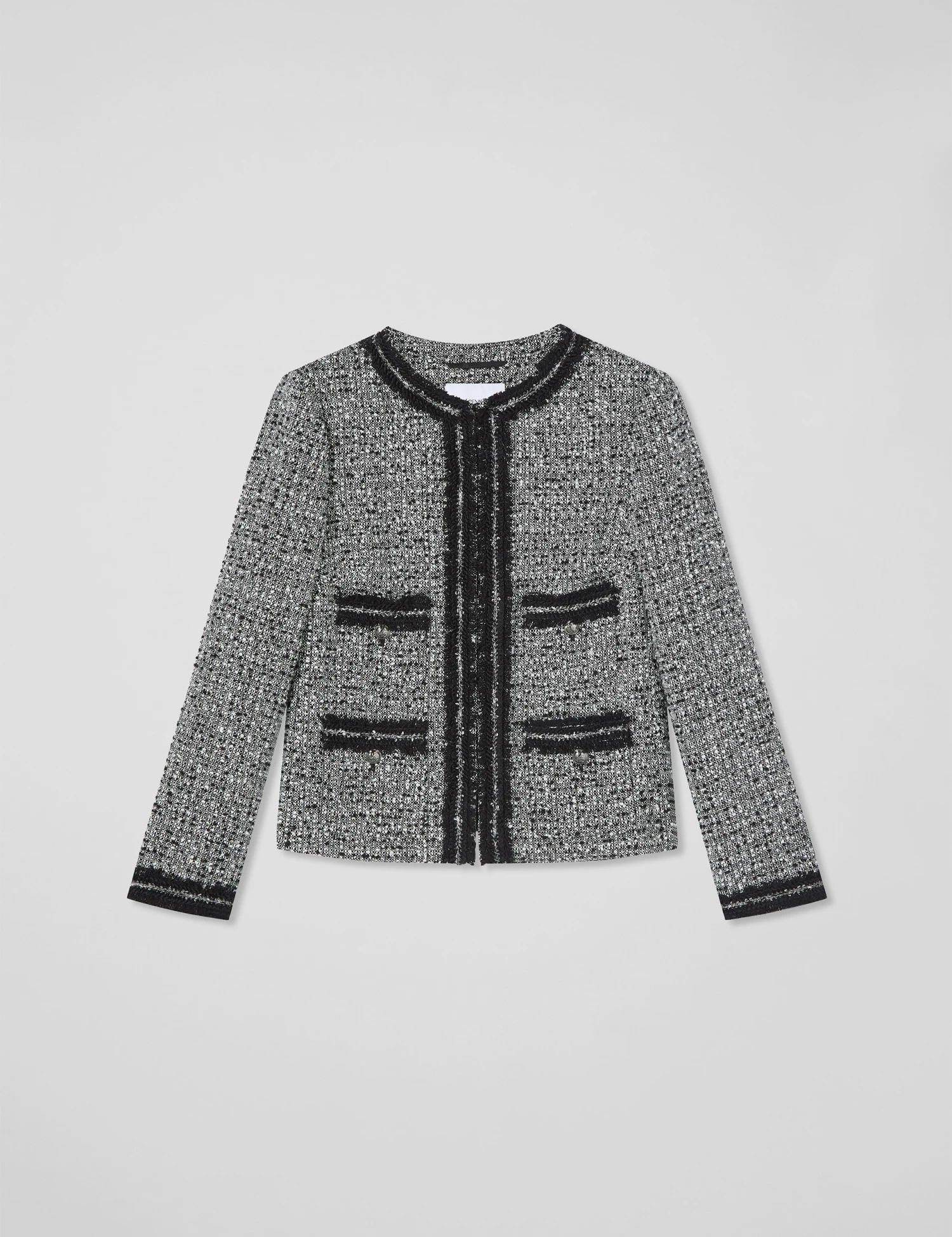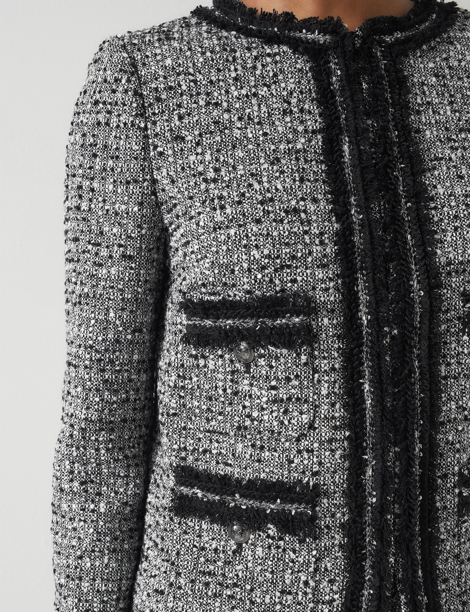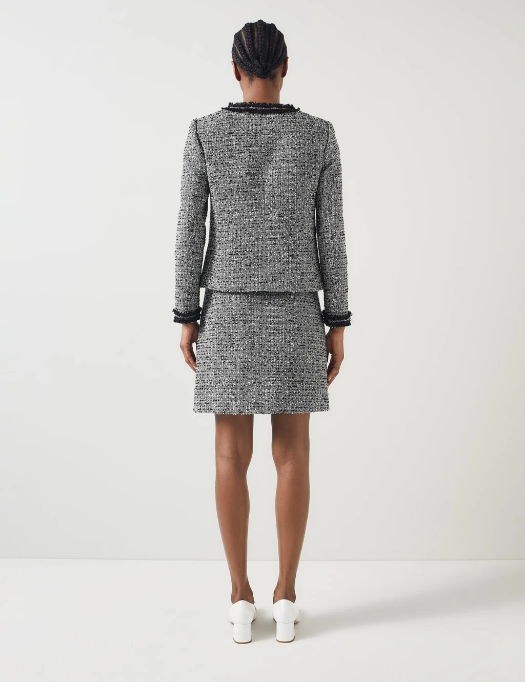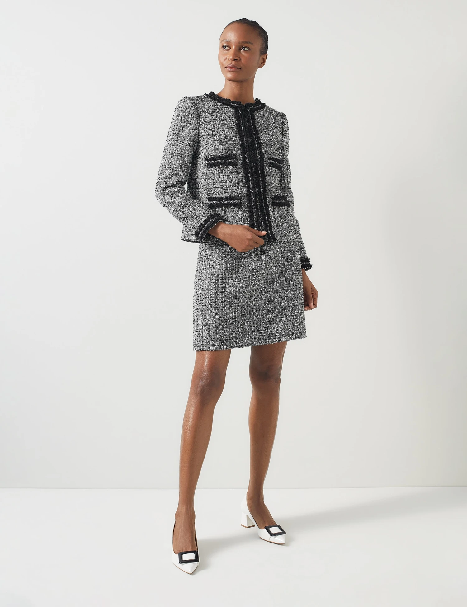 Make a stylish impression in this tweed jacket by LK Bennett. The flattering short design is cut in a regular fit and features a neat round neckline. It’s crafted from textured fabric, with eye-catching trims on the front pockets, cuffs and placket. This piece is fully lined and fastens with concealed hook and eye closures for a seamless look.