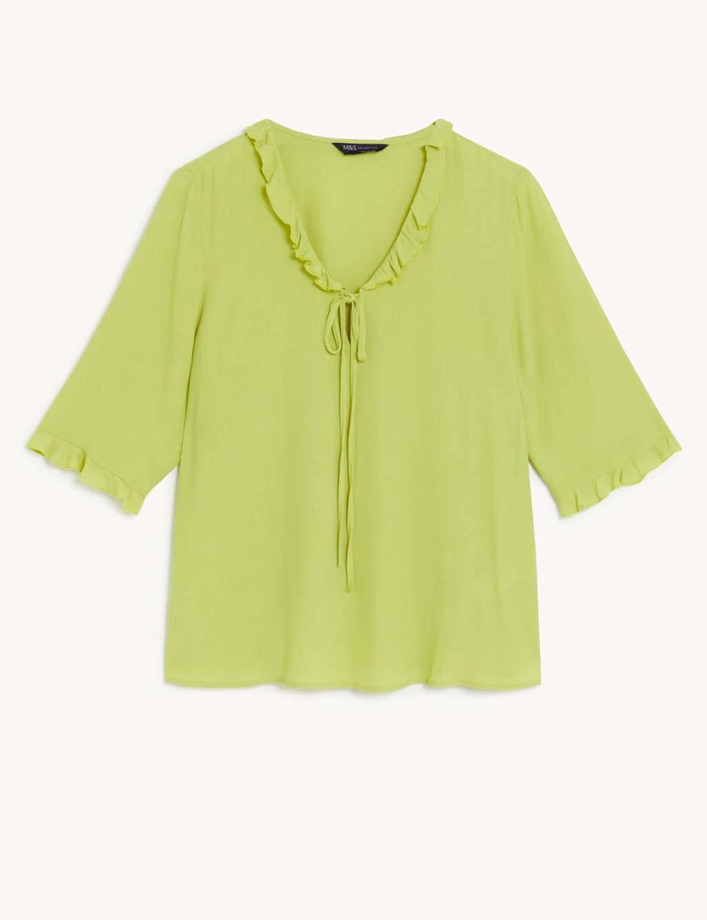 Soft frills add subtle detail to this v-neck blouse. It’s cut to a regular fit. The 3/4 sleeves finish in little frills, which complement the detailing at the neckline. A skinny tie adds the finishing touch.