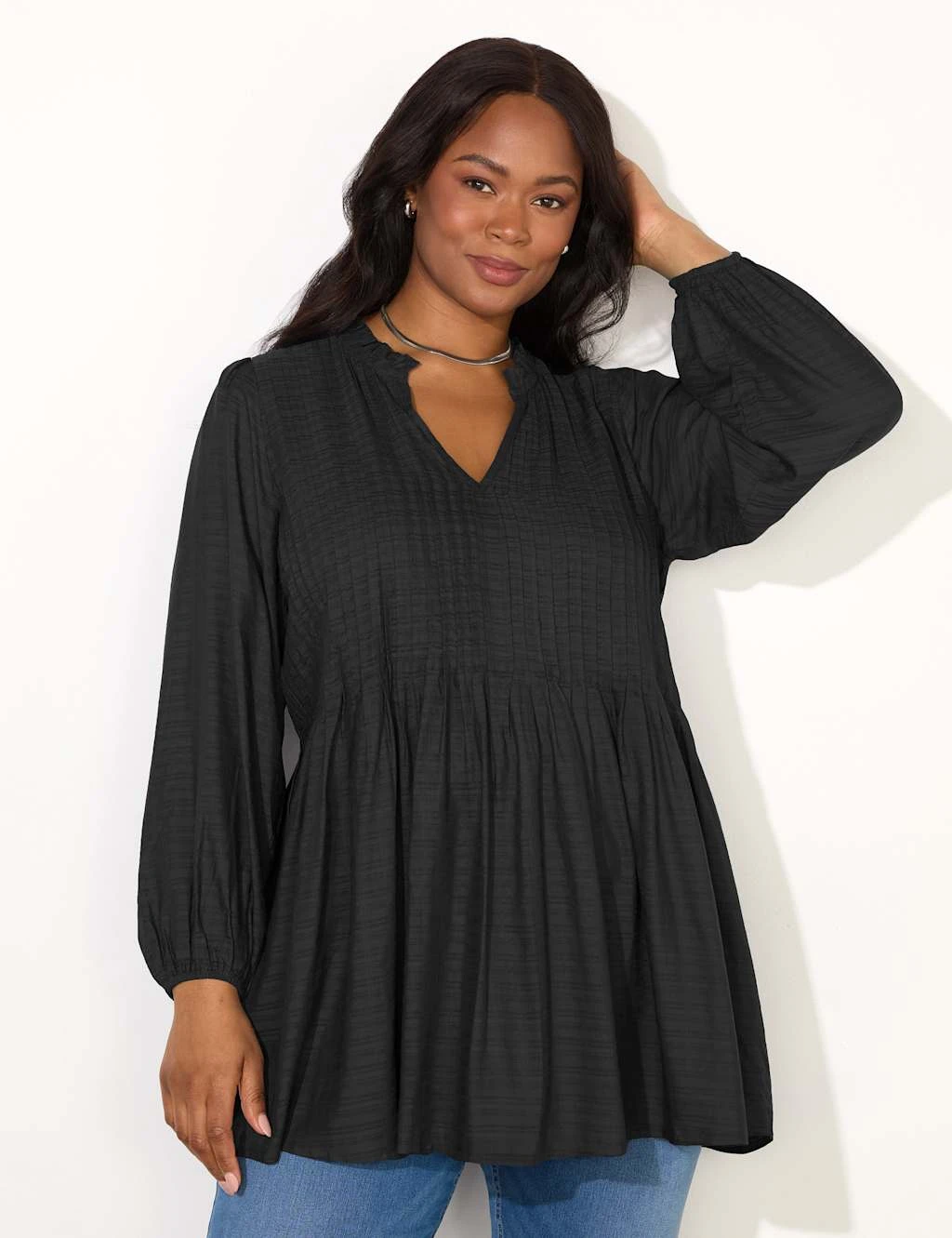 This Live Unlimited London tunic is a versatile wardrobe. It’s designed in a classic regular fit that’s drawn in at the waistline and features a flattering v-neck. The sleeves have a subtle puff shape and pintuck detailing on the bodice creates a flowing finish.