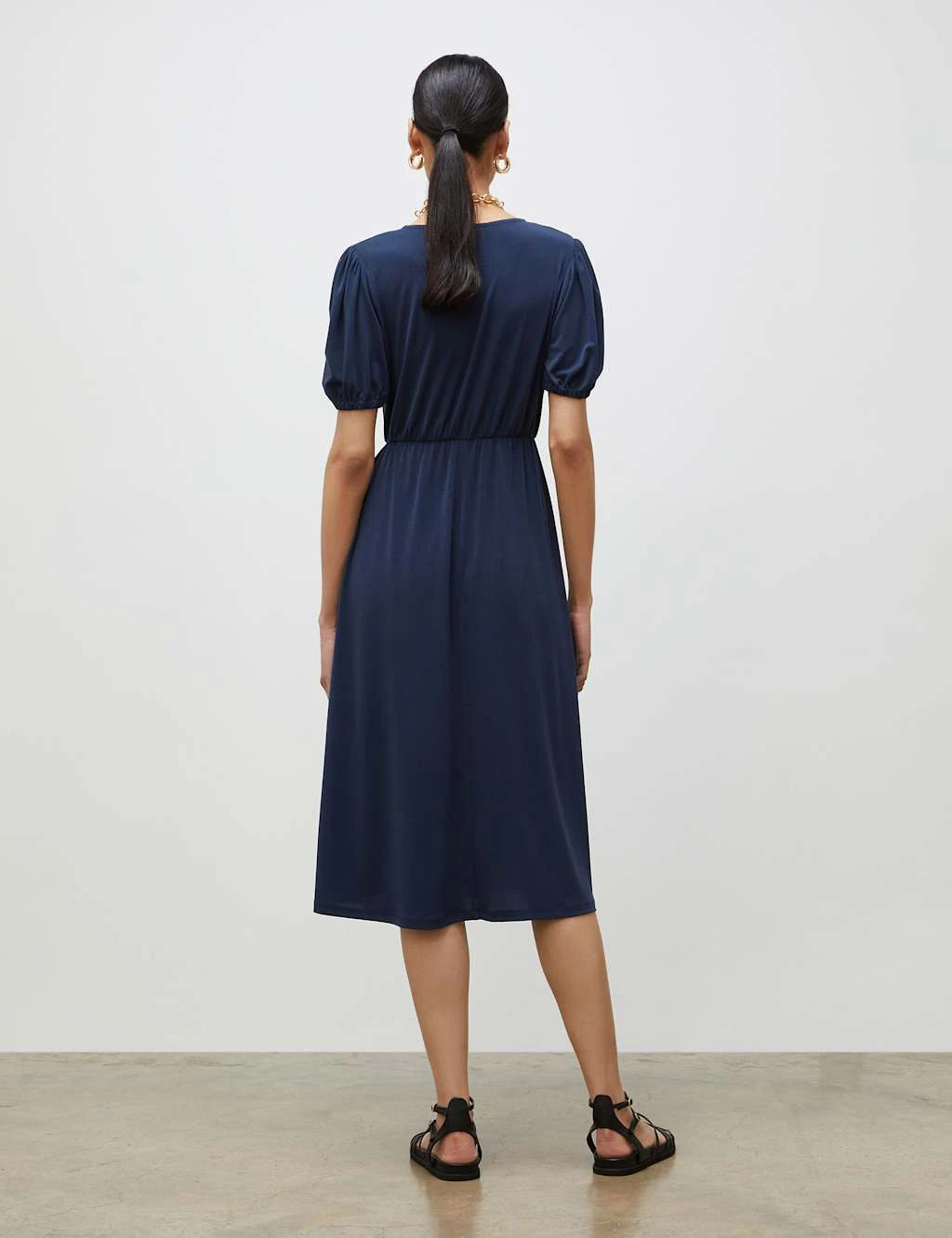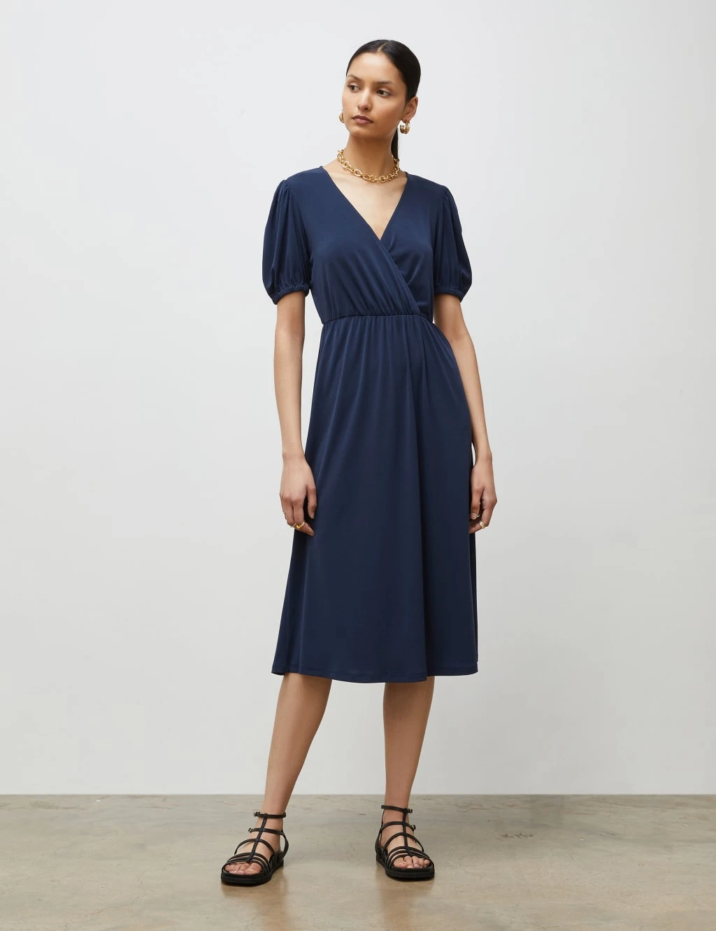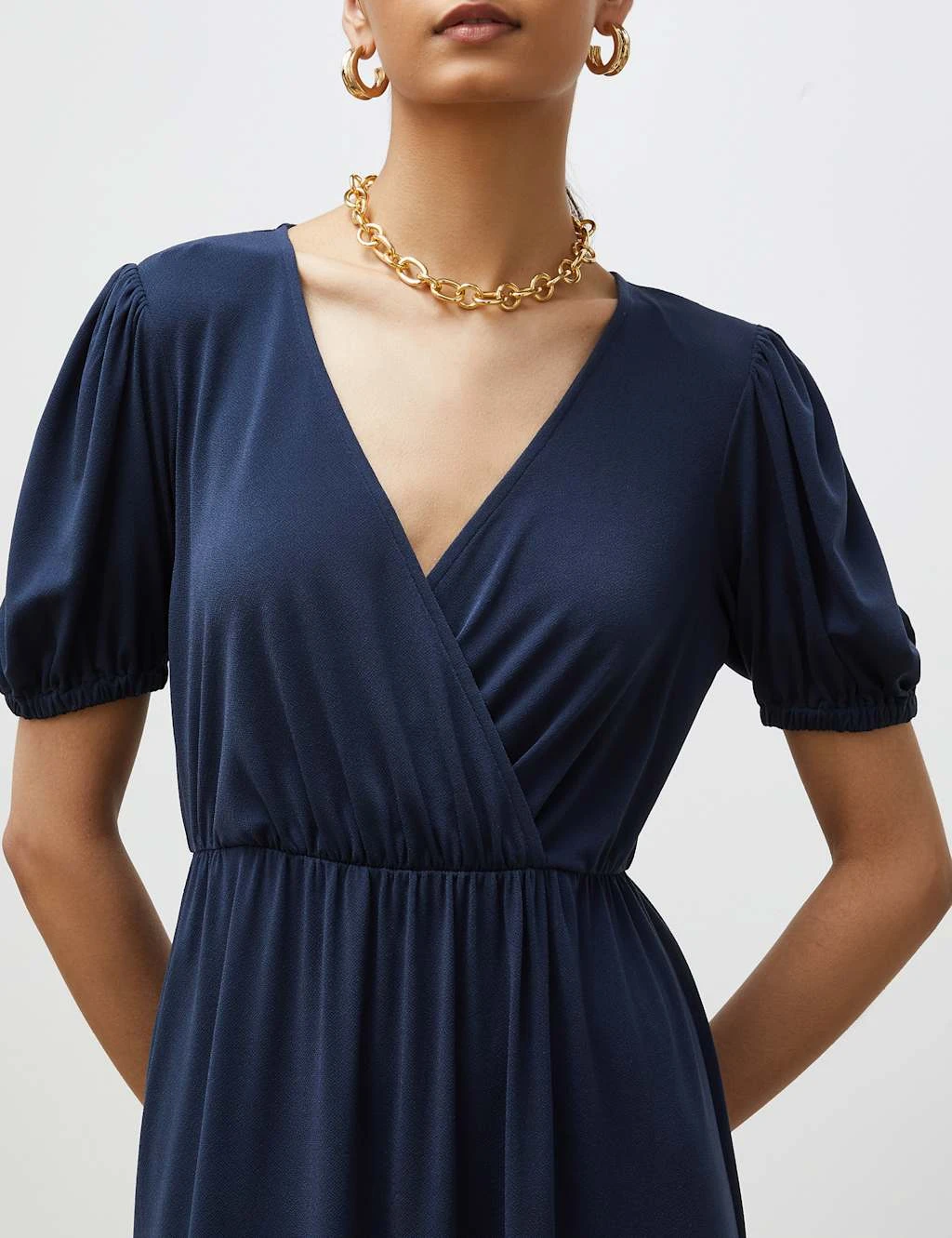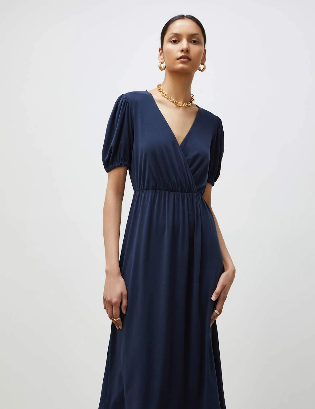 For elegance in abundance, choose this waisted dress by Finery London. It’s cut to a regular fit, with a breezy midi-length skirt and pretty short puff sleeves. A mock wrap front creates a v-neckline for a flattering silhouette. The piece is finished with gathering at the waist, which lends a lovely drape to the bodice and skirt.