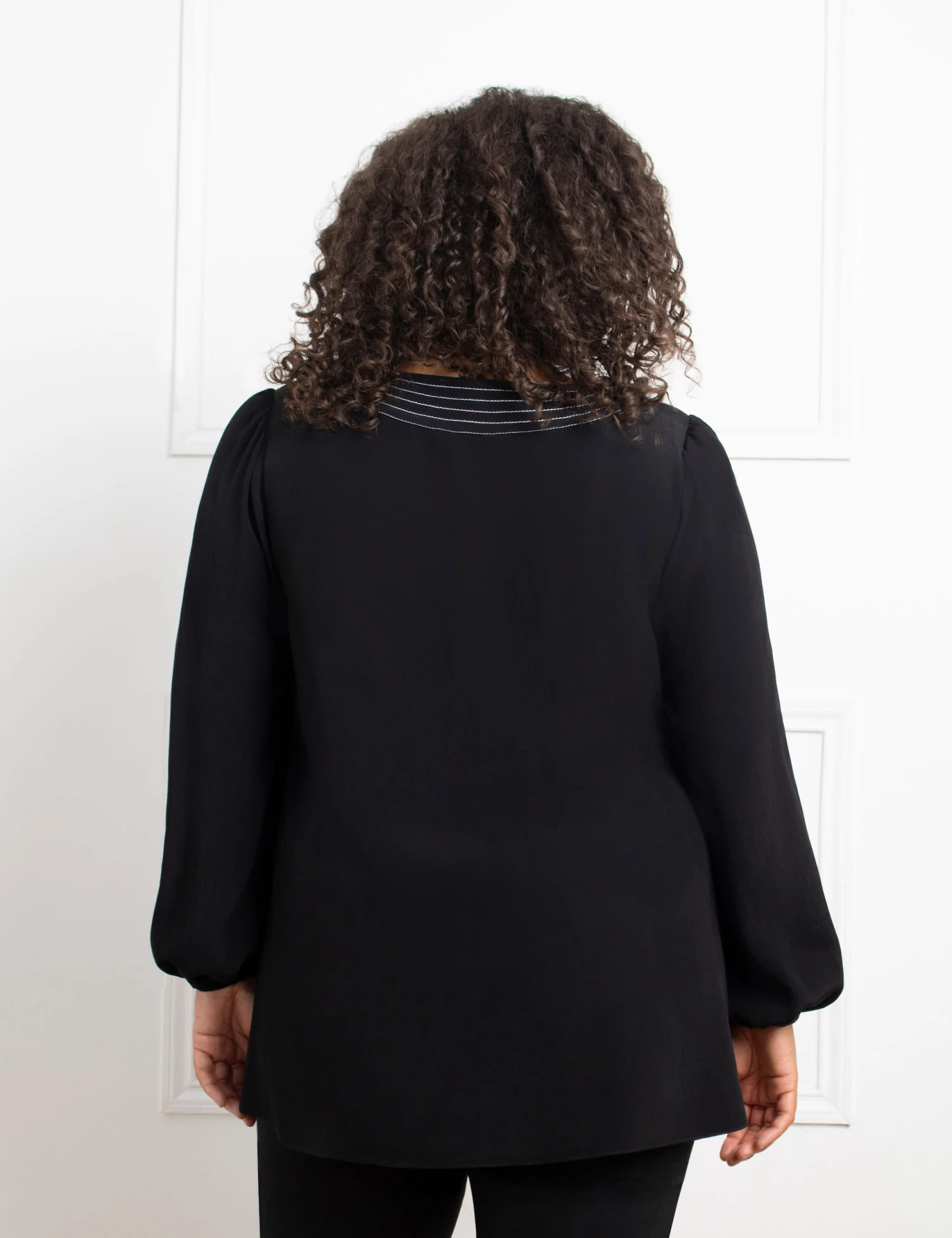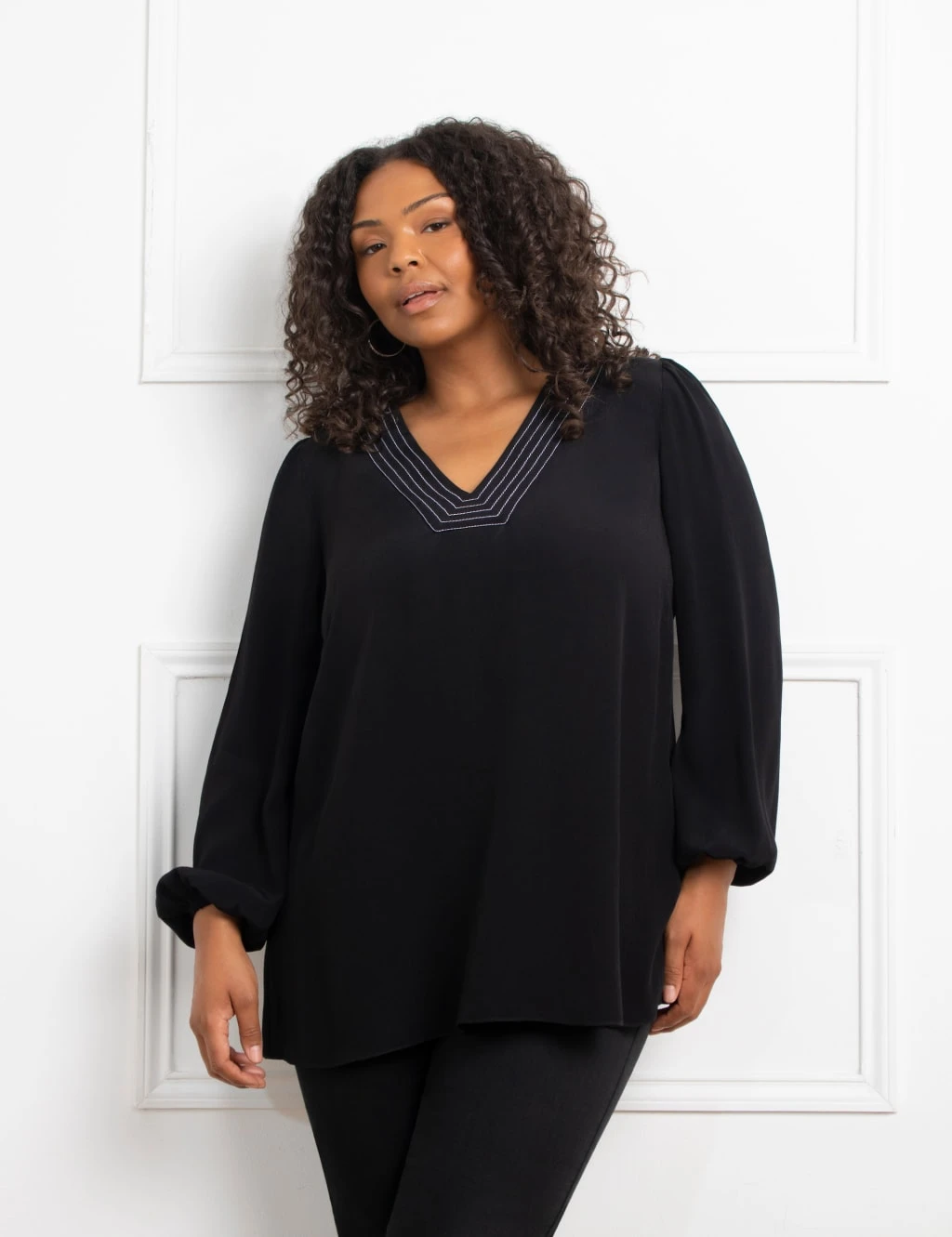 This elegant blouse from Live Unlimited London is crafted from soft jersey for an effortlessly drapey effect. It’s cut in a regular fit, with a longline hem for extra coverage. The v-neckline is decorated with contrast stitching for a statement look, while the long sleeves are gathered into elasticated cuffs.