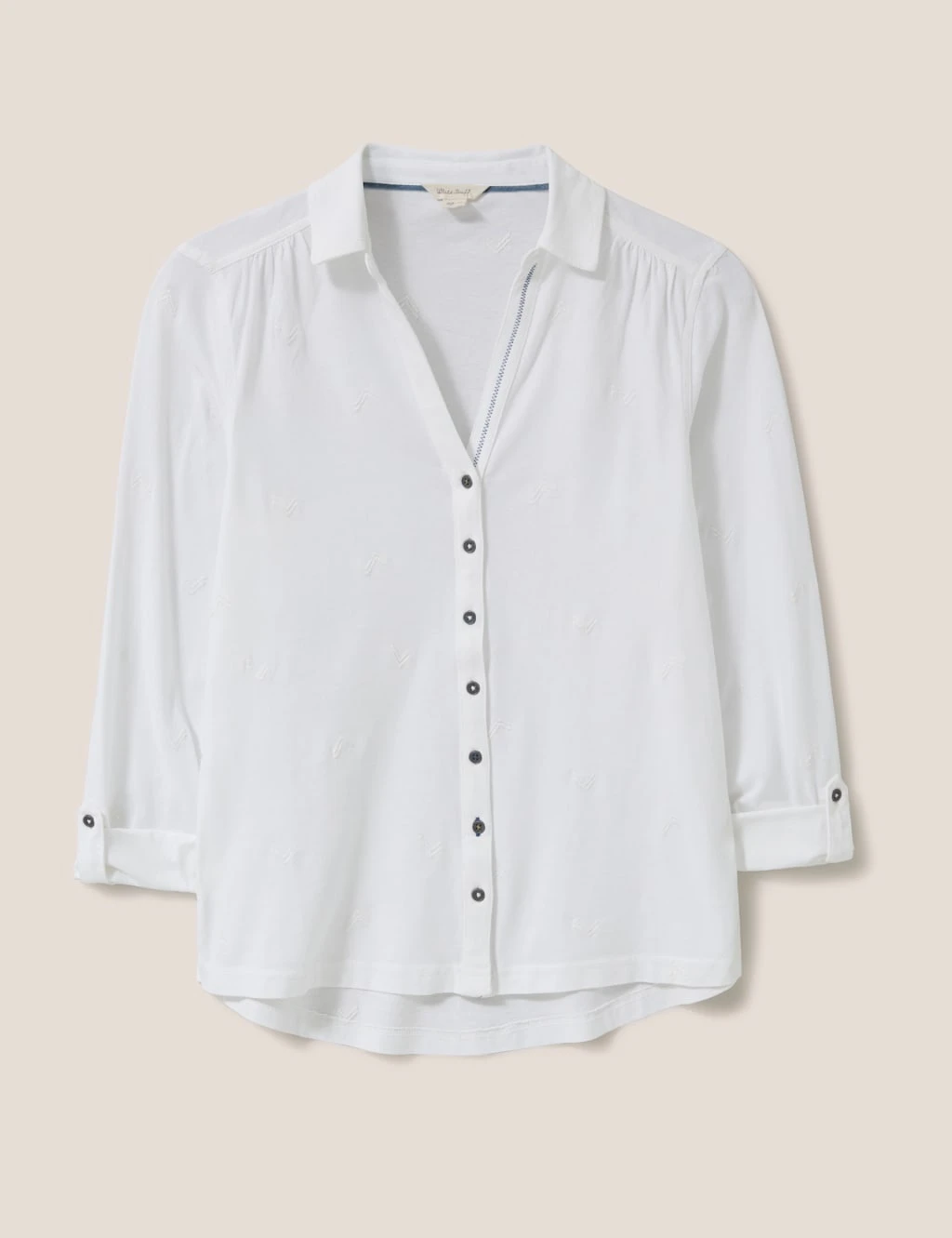 Go classic with this organic cotton jersey shirt from White Stuff. It’s made in a comfy regular fit with a collared v-neck. There are delicate metallic buttons down the front and buttoned tabs at the sleeves, so you can roll them up for a casual look. This versatile piece also features a subtle embroidered chevron pattern for a fresh look.
