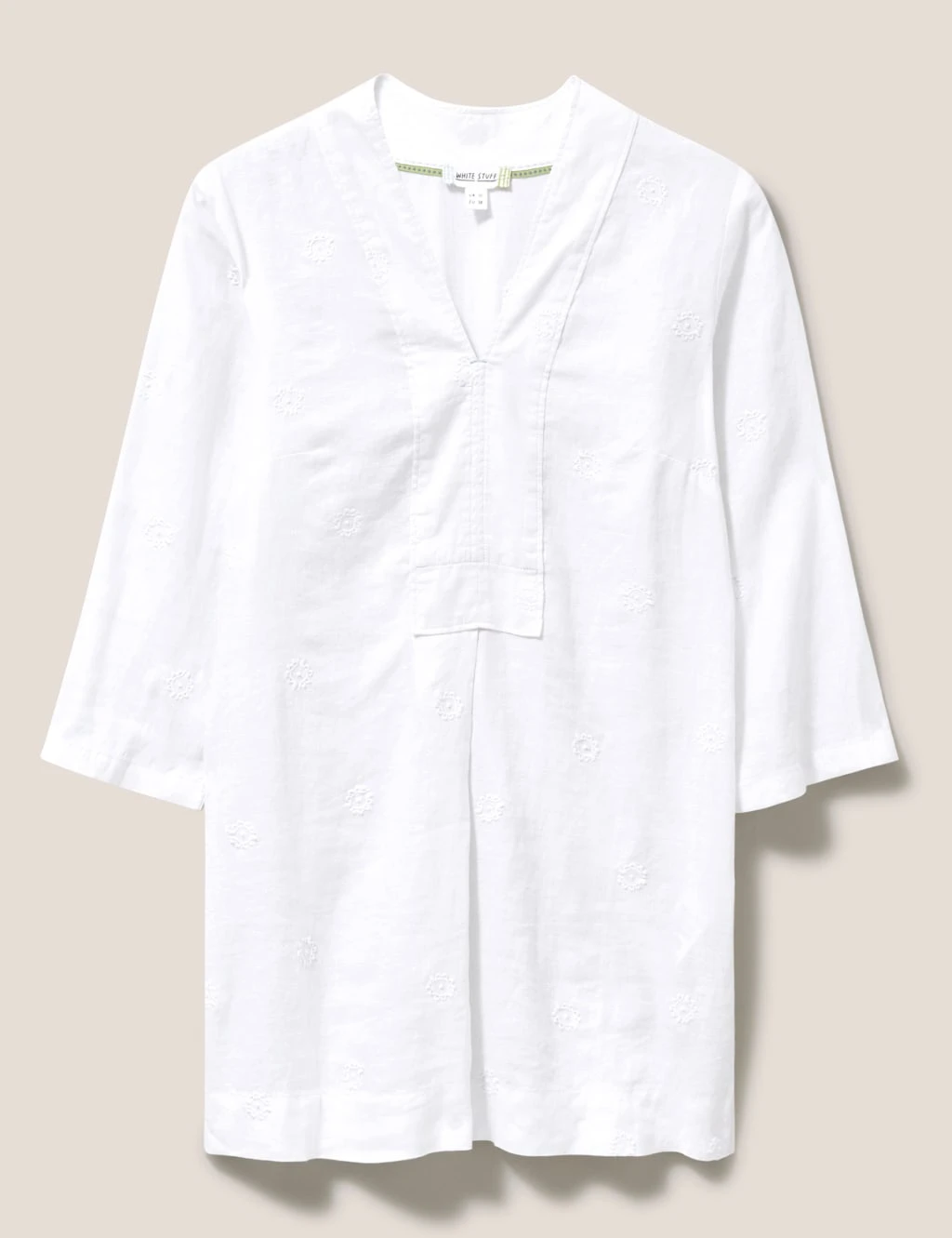 Serve up laid-back summer vibes in this pure linen tunic from White Stuff. It’s made in an easy regular fit, with a v-neck, wide three-quarter sleeves and a shirred panel at the back for extra shaping. Pretty tonal floral embroidery completes the design.