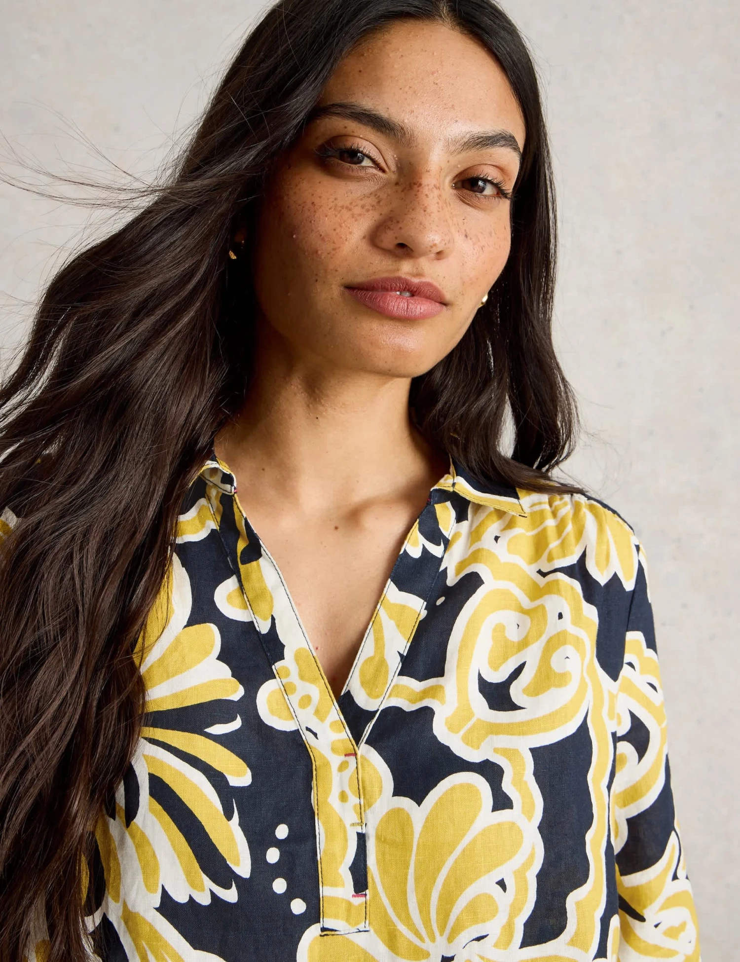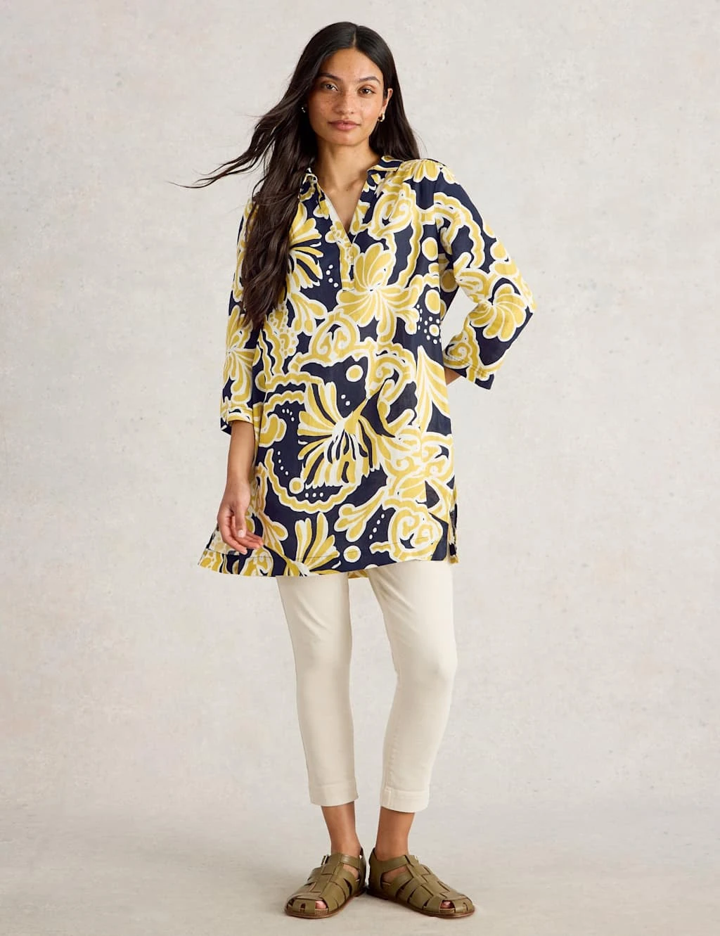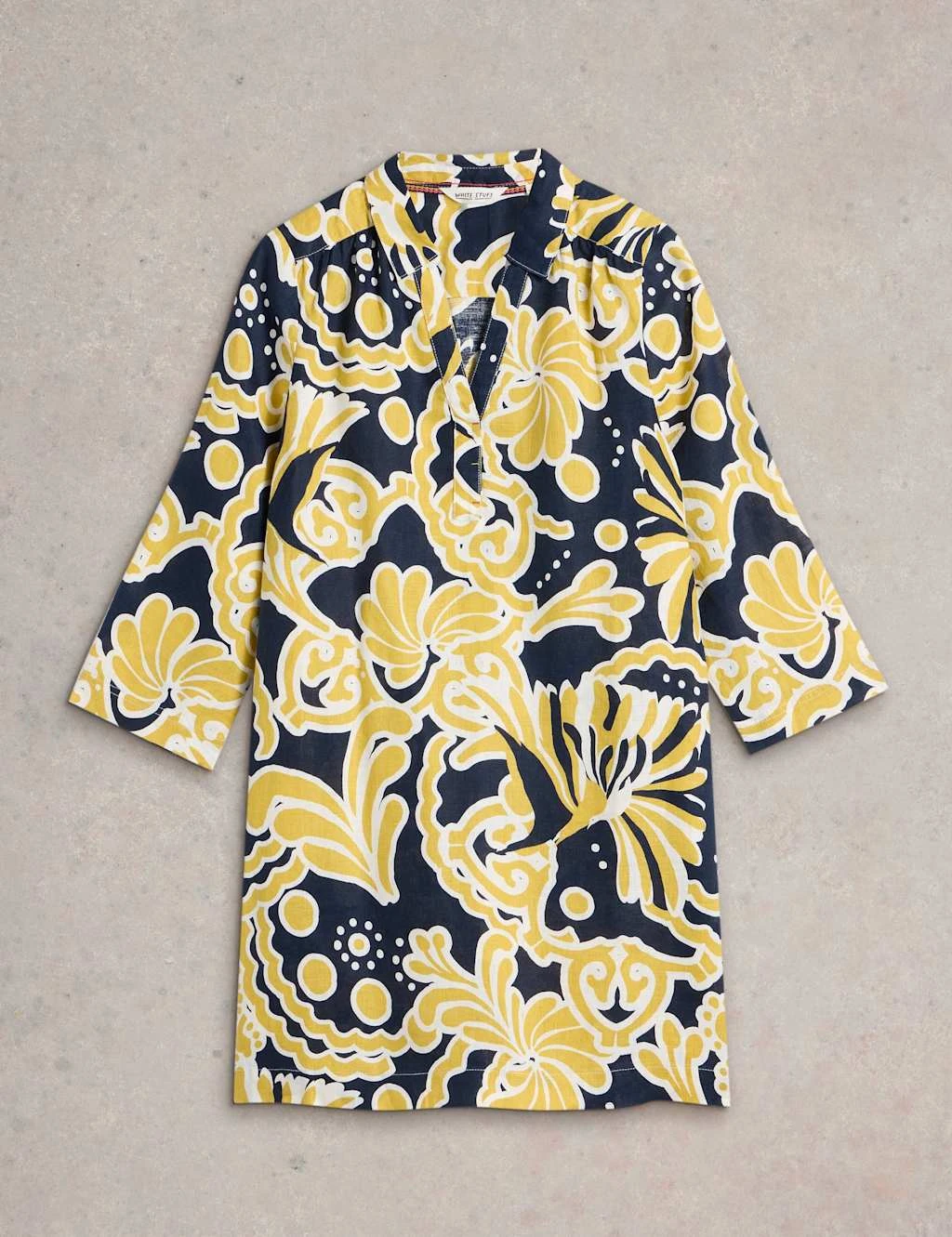 Enjoy the light and airy feel of pure linen with this stylish tunic from White Stuff. It’s cut in a comfy regular fit, with a smart collared V-neckline. The three-quarter sleeves add to the laid-back feel of the design while a bold all-over print ensures a statement look.